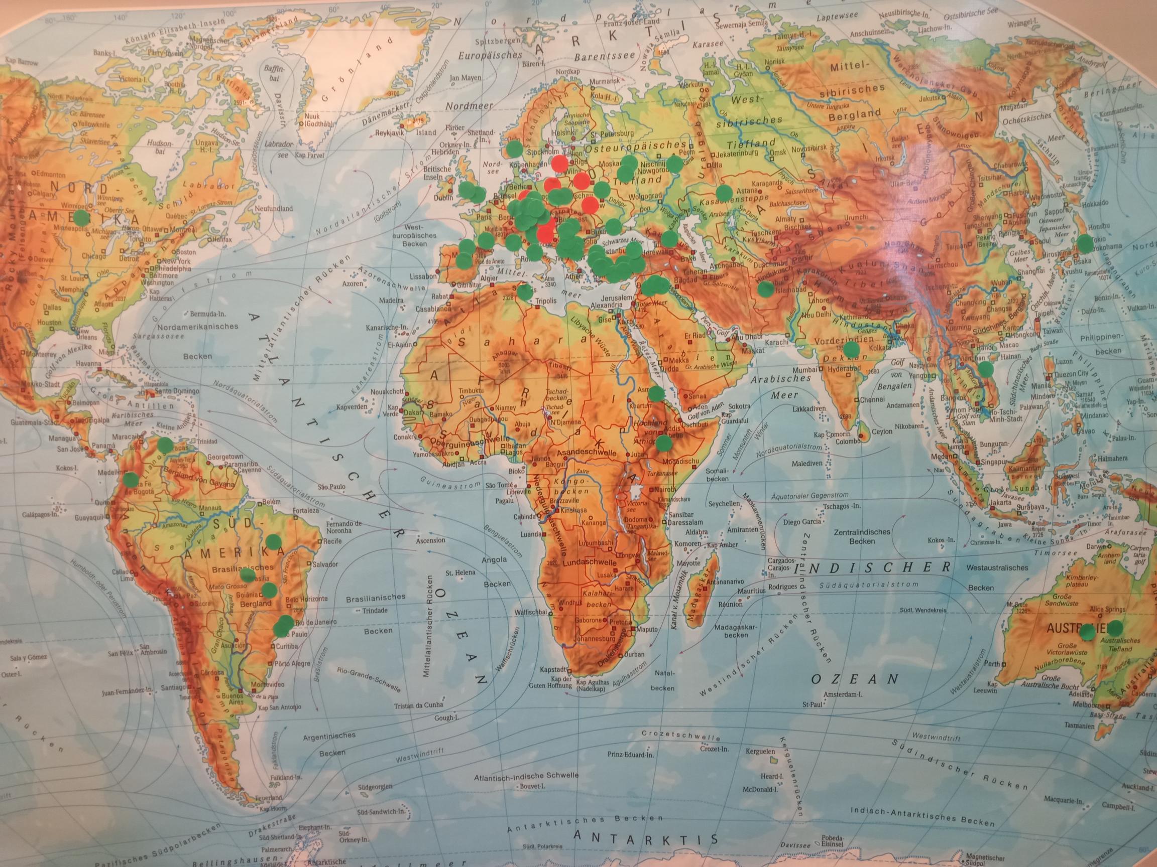 Am Welttag der Migrant*innen und Flüchtlinge wurde eine Weltkarte aufgehangen. Alle Kinder (grün) und Erwachsenen (rot) konnten mit einem Punkt auf der markieren, in welchem Land die familiären Wurzeln liegen. So wurde sichtbar, wie vielfältig die Grundschule Heumaden ist.
